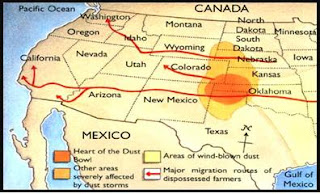 Fig 3 Localização da Bacia do Pó (Dust Bowl) no centro oeste norte americano, abrangendo os estados de , Wyoming,Dakota do Sul, Nebrasca, Colorado, Kansas,Oklahoma,Texas, Novo Mexico e parte norte do México..